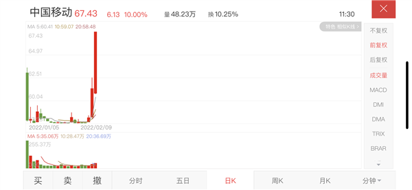 而最近两天,失去了绿鞋的中国移动却突然爆发,昨天今天两连涨,今天甚至直接涨停了,报收67.43元/股,创上市以来最高。